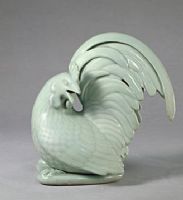 清代乾隆時(shí)期,為了體現(xiàn)高超的制瓷水平,御窯廠經(jīng)常燒造一些具有實(shí)用功能的陶瓷雕塑器,這件粉青釉雞形熏就是其中之一。雄雞尾羽舒展,神態(tài)逼真,采用了鏤空剔雕的工藝技法。熏香時(shí),可把香料放在底座中,燃出的煙霧從雄雞的口和翅間裊裊飄出,可謂用心巧妙。雞與“吉”諧音,寓意吉祥,同時(shí)也有暗示皇帝要“聞雞起舞”而勤政之意。