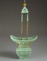 乾隆時期,瓷器的制作集歷代名窯之大成,達到了歷史高峰,精妙奇巧的器物層出不窮,以瓷器仿制的各類工藝品達到了亂真的程度。此花籃釉色與松石顏色幾無區(qū)別,并大量采用鏤雕與活環(huán)工藝,其精巧令人嘆為觀止。