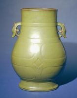 “犧”指的是古代供宗廟祭祀用的毛色純一的牲畜,這個(gè)尊的雙耳就是仿造的“犧”的形狀。茶葉末釉是廠官釉中的一種。廠官釉屬于鐵、鎂結(jié)晶釉,由于燒成工藝的某些差異,其色調(diào)有多種變化,有的似鱔魚腹際色,俗稱“鱔魚黃”,有的像茶葉研成的細(xì)末之色,俗稱“茶葉末”。此尊上的釉即可稱作茶葉末釉。
