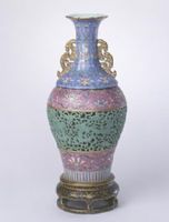 瓶身修長,敞口,溜肩,自肩處分成兩截?、頸、肩呈八棱花瓣形,飾藍地粉彩花卉紋,頸部兩側貼塑金彩夔鳳耳。瓶腹中部施松石綠釉飾鏤空云龍紋,上下飾紫地粉彩勾蓮紋。通過鏤空處可以窺見內套瓶中所繪的紅蝠紋。足部飾仰蓮瓣紋,連接仿黑漆描金底座。足底署描金“乾隆年制”四字篆書款。
