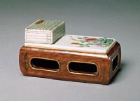 清乾隆朝的瓷質(zhì)墨床多有仿竹木釉、家具式者,其造型均秀巧新奇,施釉刻意摹仿竹木器的質(zhì)地感,并施以五彩、粉彩等紋飾,成為一類清雅優(yōu)美的文玩。
