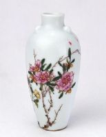 此瓶在似絹般的釉面上作畫,設色淡雅,構圖簡潔清新,有雍正琺瑯彩之遺風。