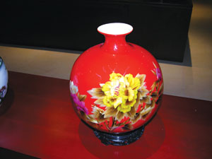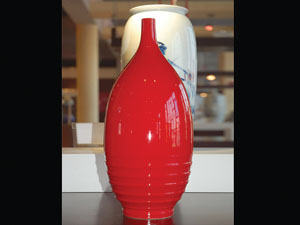 中國紅瓷的燒制采用了高科技手段,添加稀有元素并運用化學(xué)合成方法,利用特別的專用窯爐設(shè)備控制溫度,經(jīng)過1200℃~1300℃的高溫?zé),才能保證紅瓷的顏色純正、鮮亮而不褪色。在前后五次高溫?zé)七^程中,任何一個環(huán)節(jié)有脆弱之處,都會導(dǎo)致前功盡棄,可見高溫?zé)拼蠹t瓷器的艱難。
