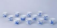 杯12件一套,撇口,深弧壁,圈足。內外施白釉,外壁青花裝飾。其上分別繪有代表12個月的花卉,并且配有與之相對應的詩句。分別是:一月,水仙花,“春風弄玉來清書 ,夜月凌波上大堤。”二月,玉蘭花,“金英翠萼帶春寒,黃色花中有幾般。”三月,桃花,“風花新社燕,時節(jié)舊春濃。”四月,牡丹花,“曉艷遠分金掌露,暮香深惹玉堂風。”五月,石榴花,“露色珠簾映,香風粉壁遮。”六月,荷花,“根是泥中玉,心承露下珠。”七月,蘭花,“廣殿輕香發(fā),高臺遠吹吟。”八月,桂花,“枝生無限月,花滿自然秋。”九月,菊花,“千載白衣酒,一生青女香。”十月,芙蓉花,“清香和宿雨,佳色出晴煙。”十一月,月季花,“不隨千種盡,獨放一年紅。”十二月,梅花,“素艷雪凝樹,清香風滿枝。”詩句的結尾用書寫的形式鈐青花篆體“賞”字。
