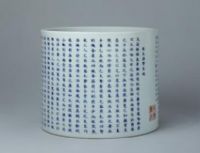 筆筒呈圓桶形,直壁,口足尺寸相若,玉璧形底足。內(nèi)外施白釉,外壁的主題圖案為青花楷書《圣主得賢臣頌》一篇。文章的結(jié)尾用書寫的形式鈐釉里紅“康熙傳古”篆體印。文字筆畫工整,娟秀清晰。底心施白釉,署青花楷書“大清康熙年制” 三行六字款。