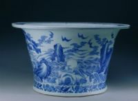 盆折沿,斜壁,近足處凹進一周,砂底無釉,中心有滲水圓孔。內(nèi)外施白釉。外壁通體青花裝飾。折沿上繪纏枝蓮紋,花紋中夾雜篆體“壽”字。腹部描繪蒼松、山石、海浪、旭日、祥云、蝙蝠等。因松樹象征長壽,“蝠”諧“福”音,因此,整個畫面寓意海天浴日、壽山福海。近足處輔以荷花紋邊飾?谘叵率鹎嗷ǹw“大清康熙年制”六字橫排款。