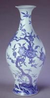 雍正朝官窯瓷器以造型端莊、做工精細(xì)著稱。此瓶造型秀麗,構(gòu)圖疏密得當(dāng),工藝精巧。青花畫(huà)風(fēng)仿明永樂(lè)、宣德風(fēng)格,以點(diǎn)染的重筆模仿鐵結(jié)晶斑點(diǎn),于清秀中顯露出古樸剛勁之風(fēng)。圖案中的桃實(shí)、桃花、桃枝、蝙蝠、靈芝、竹子等,在傳統(tǒng)文化中均屬于吉祥圖案,寓意福壽吉祥。此瓶為雍正官窯青花瓷器的杰出之作。