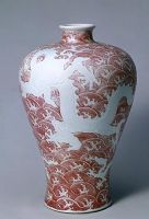 此瓶器形挺拔端莊,裝飾手法新穎,紅白二色交相輝映,海濤中騰躍的大小二龍,有“蒼龍教子”之寓意。