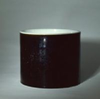 筆筒口底相若,直壁,平底。里施白釉,外壁通體施烏金釉,釉面漆黑明亮。釉上以金彩描繪紋飾,金彩雖全部脫落,但迎光側(cè)視,仍可見(jiàn)圖案痕跡:一面有委角方形開(kāi)光,開(kāi)光內(nèi)繪山水人物紋。另一面書蘇軾《后赤壁賦》全文,文末書“己丑歲仲冬月右錄赤壁賦”及兩枚圓、方閑章款。外底施白釉,中間有一周玉璧形澀圈。無(wú)款識(shí)。