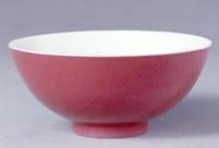 此瓶呈粉紅色的胭脂水釉勻凈光潔,在細(xì)白的底釉映襯下,更顯嬌麗。此碗制作過(guò)程是先燒出精致的白瓷小碗,然后采用噴釉的方法將釉漿均勻地噴射其上,再入低溫小爐在800℃的溫度下燒成,屬于清代稀有的色釉品種之一。胭脂水釉主要用于小件器,如小碗、小瓶、小高足杯、菊瓣盤等,是清代康熙年間新創(chuàng)的品種,雍正時(shí)期燒造得最為精致,乾隆朝之后直到晚清都在燒制,只是呈色越來(lái)越差。此小碗造型優(yōu)雅,小巧玲瓏,其底釉極白,胭脂水釉粉嫩嬌艷,代表了清代這一品種的最高成就。