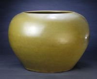 鱔魚黃釉屬于鐵、鎂結(jié)晶釉,清代宮廷檔案稱之為“廠官釉”。由于燒成工藝的某些差異,廠官釉的色調(diào)有多種變化。清雍正時(shí)期廠官釉品種名目繁多,如蟹甲青、鱔魚黃、瓜皮綠等。此缽釉色偏黃,色如鱔魚皮色,勻凈優(yōu)雅,且器型規(guī)整,為典型的雍正朝制品。
