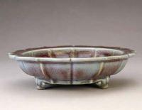 盆托折沿,通體六瓣菱花式,下承以三個云頭形足。里外滿施仿鈞釉,底刻陽文篆書“大清雍正年制”三行六字款。