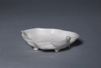 洗呈楸葉式,淺腹,底下承以不規(guī)則六足。通體施白釉。內(nèi)光素?zé)o紋飾,外壁清晰可見其葉脈,底堆貼盛開的梅花。