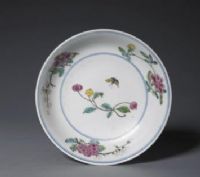 粉彩瓷器初創(chuàng)于康熙晚期,是在五彩的基礎(chǔ)上受琺瑯彩瓷器的影響而創(chuàng)燒出的一種新型彩瓷?滴醴鄄蚀善魈幱诔鮿(chuàng)階段,造型有盤、水丞等。此盤用平涂法繪畫,畫筆簡(jiǎn)練,施彩較厚,色階不夠豐富,顯示出粉彩瓷器初創(chuàng)階段的特點(diǎn)。此種盤也見署楷體“大明成化年制”仿款者。