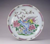 此盤的裝飾風(fēng)格接近清康熙時(shí)期的粉彩瓷器,尤其是口沿處的一周錦地開(kāi)光和圖案充滿盤心的裝飾方法在康熙時(shí)期的粉彩器物中很常見(jiàn),由此推斷這件器物應(yīng)是雍正早期的作品。在裝飾上運(yùn)用雉雞、牡丹、洞石等,寓意“吉祥富貴”和“長(zhǎng)壽富貴”,這種借物寓意的裝飾手法在清代瓷器上很流行。此盤構(gòu)圖嚴(yán)謹(jǐn),運(yùn)筆流暢,雉雞的形象栩栩如生,盛開(kāi)的牡丹花和用藍(lán)料彩描繪的太湖石使畫面平添了幾分生機(jī)。