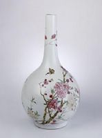 瓶直口,長(zhǎng)頸,圓腹,圈足外撇。通體白釉,粉彩裝飾。外壁繪桃樹一株,蔓遍器身,花蕾欲放,鮮花婀娜,綠葉青翠,彩蝶飛舞其間。胭脂紅彩描繪的花朵顏色深淺不同,花心部分色料最厚,從花心到花瓣邊沿紅色漸趨淺淡。圈足內(nèi)施白釉。外底署青花楷書“大清雍正年制” 雙行六字款,外圍青花雙線圈。