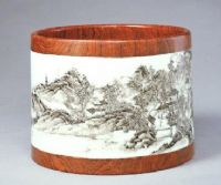 筆筒直口,璧形底。器里及外壁上下沿施木紋釉,外壁中部以墨彩繪山水圖,意境清逸典雅。