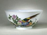 弧壁,圈足,底有藍(lán)料正楷“雍正年制”四字款。碗胎體極薄,屬于半脫胎,內(nèi)外釉白如雪,瑩潤(rùn)如玉。碗外壁一側(cè)繪雉雞牡丹花,另一側(cè)題墨彩詩句,色彩鮮艷雅逸,畫法精工絕倫。畫面中心是一雄雉雞,在山石牡丹叢中尋食,尾翼上的各色羽毛絨光如絹,絢爛奪目。雉雞的頭頸是滕黃色,背部藍(lán)綠相間,腹腿鐵紅,尾羽赭褐色。周圍的山石花草以粉紅、藕荷、杏黃、淡黃、水綠等嬌嫩顏色相襯托,直如一幅工筆花鳥畫般美妙動(dòng)人。又配五言行草書體詩句:“嫩蕊包金粉,重葩結(jié)繡云”。字句的首、尾有胭脂水章“佳麗”及“金成”、“旭映”。