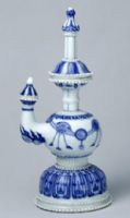 此壺造型仿藏族銀制賁巴壺?zé)於,制作精巧,新穎別致,青花發(fā)色濃艷。紋飾具有濃厚的少數(shù)民族藝術(shù)風(fēng)格,為瓷器中的精品。