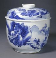 罐直口,短頸,圈足。器蓋平頂,微折沿,有環(huán)形抓鈕。罐通體飾青花山水人物圖案。青花嬌艷青翠,清新明快,具有水墨畫的藝術(shù)效果。畫面層次分明,富有立體感。畫中的文人高士、獨(dú)釣老翁等形象生動(dòng)。此器胎精體重,瓷質(zhì)潔白細(xì)膩,為康熙朝民間青花瓷器的代表作。