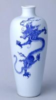 瓶口微撇,短頸,圓肩,肩以下漸收,圈足。瓶身繪立龍2條,張牙舞爪,龍身卷曲,威武兇猛。足內(nèi)有青花楷書(shū)“大清康熙年制”六字款。