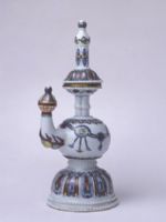 器形仿藏族銀制賁巴壺形式,造型略如塔,口、流均有蓋,新穎別致。壺直口,曲流,圓鼓腹,下承覆缽形托,圈足,足底沿外撇。通體以白色乳釘紋為界將紋飾分為不同的單元。用斗彩繪蓮瓣紋、如意云紋、火云紋等,腹部獸面瓔珞紋為主題圖案。