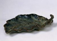 洗通體仿楸葉形,內(nèi)外雕刻凹凸的葉脈,葉邊堆貼4朵盛開的花,并刻出7枚花蕾。胎體厚重,釉層凝厚,深藍色釉中滲化出蔥白色雨點狀花斑。此洗造型新穎,窯變花釉揮灑自如,卷曲的葉邊仿佛被微風(fēng)吹動,頗有天然韻致。