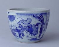 缸直口,平沿,深腹,腹下漸收斂,平底,底心略凹。內(nèi)施白釉。外壁繪青花人物紋。山石掩映的軍帳前旌旗招展,大將呂布頭戴束發(fā)冠,身穿百花袍,身后有一侍者,周圍站立幾名武士,手持各式兵器。呂布對(duì)面李肅手捧珍寶,獻(xiàn)給呂布,其身后的幾名隨從也各持寶物。周圍繪有旗幟、軍帳、城池、山水、草木等。外底素胎無釉。無款識(shí)。
