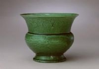 瓜皮綠釉創(chuàng)燒于明代早期,它是一種玻璃質(zhì)的低溫銅綠釉,因釉色似西瓜皮色,故俗稱“瓜皮綠”。嘉靖時景德鎮(zhèn)官窯燒造的瓜皮綠釉器最為著名,器形以碗、盤等小件圓器為主,尊、罐等大件琢器比較少見