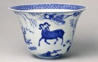 此碗是一件明代嘉靖年間景德鎮(zhèn)御窯廠燒造的宮廷用瓷器。碗呈仰鐘式,內(nèi)外均為青花裝飾。碗心繪麒麟,輔以松、石、花草。碗內(nèi)近口沿處繪錦紋。外壁繪神態(tài)各異的三羊,一羊正面佇立,一羊側(cè)面作行走狀,一羊回首觀望。三羊間襯以松、竹、梅及楊柳、芭蕉。外底署青花“大明嘉靖年制”六字雙行款,外圍雙圈。
