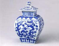 罐四方形,有蓋。蓋面飾如意云紋,罐頸飾回紋,肩部為蕉葉紋,腹部四面分別繪雙云龍紋,足邊為變形蓮瓣紋。底青花雙方欄內(nèi)書“大明嘉靖年制”雙行六字楷書款。