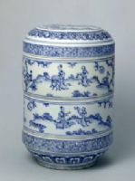 人物間之云氣紋的畫法雖然尚有前朝遺風(fēng),但從其青花呈色、器物造型上看,則體現(xiàn)了正德時(shí)期青花器物的特點(diǎn)。此盒造型秀麗端正,保存完整,是極為罕見的明代傳世套盒