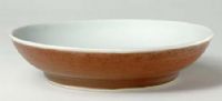 盤敞口,弧壁,圈足,底微塌。因形似鳥窩,俗稱“窩盤”。盤里及足內(nèi)均施白釉。外壁施高溫銅紅釉。紅釉釉層肥腴,呈色鮮艷,燦若天然紅寶石。由于釉層氣泡大且密集,釉面泛桔皮紋,使入射光線發(fā)生散射,視之柔和悅目。圈足外墻積釉處紅里透黑,宛如青蝦之背?谘匾蚋邷責蓵r釉料熔融、垂流而顯露白色胎骨,形成一道圓潤的白邊。胎體較厚,外底青花雙圈,內(nèi)楷書“大明成化年制”雙行六字款,色澤淡雅,頓挫有力。