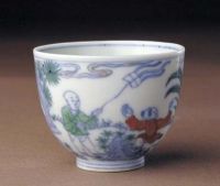 斗彩初創(chuàng)于明宣德年間,是一種以釉下青花勾線,再以釉上彩繪填彩的方法。斗彩工藝至成化年間趨于成熟,燒制的斗彩瓷也最為精美,因使用的是國(guó)產(chǎn)平等青料,具有呈色穩(wěn)定、色澤淡雅的特點(diǎn),再加艷麗的釉上色彩,使其形成主次分明、交相輝映的藝術(shù)格調(diào)!恫┪镆[》云:“若宣窯五彩,深厚堆垛,成窯用色淺深,頗有畫(huà)意。”成化官窯制品常見(jiàn)高足杯、酒杯、盤(pán)、碗、罐等小型器物,造型玲瓏奇秀,胎體細(xì)潤(rùn),彩料精純,繪畫(huà)淡雅幽婉。此件斗彩嬰戲圖杯即其中的代表作之一。此杯造型輕盈秀雅,胎體潔白細(xì)膩,所繪嬰戲紋飾為成化器中少見(jiàn)的題材,愈益珍貴。明嘉靖年間有此件器物的仿品。