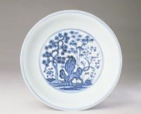 宣德青花瓷器造型敦厚端莊,釉面青亮,紋飾細膩豪放,筆法瀟灑,一向被列為明代青花之冠。此盤主題紋飾為松竹梅紋。松竹梅世稱“歲寒三友” ,寓意高風亮節(jié)。外壁繪畫的庭園仕女圖為研究明代貴族婦女的生活提供了寶貴的資料。由于宣德時期青花原料數(shù)量較少,因此在青花器上繪制人物圖案者為數(shù)不多,此器則更顯珍貴。