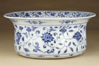 此盆青花呈色濃艷,有暈散現(xiàn)象,為蘇泥勃青料所致。紋飾繁復(fù)生動(dòng),層次分明,是永樂時(shí)期受西亞國家金銀器的影響而創(chuàng)燒的一種新器型。