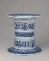 尊身為直筒狀,上下口處均為寬折沿。通體青花紋飾,口及底沿飾菊瓣紋,器身紋飾分三層,上、下兩層仿寫阿拉伯文并繪團(tuán)形圖案,中間一層飾仰覆變形花瓣紋。