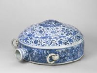 瓶直口,短頸,頸部凸起一周弦紋,一側(cè)飾小系。腹體一面扁平無釉,中心凹進(jìn)如臍,另一面隆起,中心凸出如半球狀,肩兩側(cè)各有一活環(huán)耳。通體以青花裝飾,口沿處繪纏枝花,腹部凸起處飾海水江崖地八角錦紋,內(nèi)繪纏枝花,其外圍飾纏枝花,瓶壁側(cè)面飾海水江崖紋。青花色澤濃艷,紋飾流暢自然,極富動(dòng)感。
