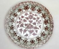 明洪武釉里紅器裝飾以植物題材為主,其植物種類之繁多,內(nèi)容之新奇,是以前各時期所無法比擬的。這件洪武釉里紅大盤紋飾富麗多彩,釉面發(fā)色純正鮮艷,較好地體現(xiàn)了明初釉里紅的燒制成就,在品種、數(shù)量都不甚多的明初釉里紅器中堪稱珍品。
