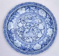 元代青花瓷器裝飾有兩種形式:一種以白色為地,藍(lán)色為花,用青花原料直接在白色胎體上進(jìn)行繪制。另一種是青花為地,以湛藍(lán)青翠的地色襯托出白色的花紋。青花麟鳳紋盤為藍(lán)地白花器之代表作,表現(xiàn)出與白地藍(lán)花器完全不同的藝術(shù)效果。此類器之傳世品極罕見,鳳毛麟角,世之珍品。