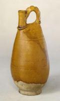 壺式較高,上扁下圓。壺上端一側(cè)出管狀口,口與肩上另一側(cè)連以雞冠狀提梁,管與提梁根部飾凸起的帶狀飾物。壺下部飽滿,圈足微外撇。釉下施白色化妝土,黃釉施至近足部。釉色光亮,釉面開有細(xì)小的紋片。