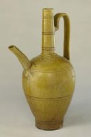 壺直口,細(xì)長頸,豐肩,長圓腹,圈足。一側(cè)為八棱形壺流,流細(xì)長彎曲,根部飾一皮扣狀裝飾,另一側(cè)為帶狀長柄,連于頸肩。自壺口至近足處,通體飾弦紋6組。器身施黃釉,釉面光亮瑩潤。