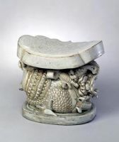 枕分上、中、下三部分,上部枕面為如意形,其上刻纏枝花紋;中部雕塑雙獅作搏斗狀;下部為腰圓形,枕底胎厚重無釉。其整體施青白釉,釉色勻凈。