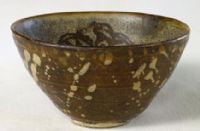 碗敞口,碗式較深,淺足露胎。里外施兩種釉,外施醬釉,點以淺黃色斑點,里為窯變花釉。碗內(nèi)壁飾3組醬色菱形開光式剪紙紋樣。