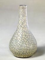 瓶小口,長頸,頸下漸闊,最長徑在近足部,圈足上寬下窄。通體施米色釉,開黑色、米色紋片,俗稱金絲鐵線,呈自右上向左的斜紋。此瓶造型秀美,器型為宋代所僅見,釉色潤澤,紋片典型。此類器傳世極少,彌足珍貴。