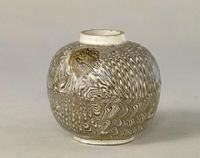 罐圓口,短頸,鼓腹,平底。頸部施白釉,外腹部釉色為褐白兩色,紋飾呈羽毛狀。