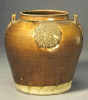 罐唇口,直頸,豐肩,圓腹,腹下斂,平底。胎呈灰白色,器身施褐中泛黃色釉。肩部有對稱方形雙耳及四朵模印貼花紋。近足處一周及底部素胎無釉。