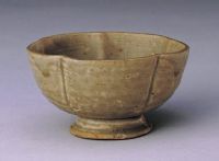 杯為五瓣花口,圈足外撇,器形小巧,釉色青潤。造型仿同時期金銀質地的高足杯,是晚唐時期青瓷器的流行樣式,反映了當時青瓷器逐漸替代金銀器的發(fā)展趨勢。此種形制的瓷器至宋、元時期依然流行。