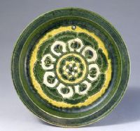 盤口為板沿式,平底,下承3足。通體以綠釉為地,盤心刻一團(tuán)花,外環(huán)荷花、花蕾及荷葉紋,施以黃、綠、白三色。底無釉。