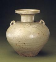 壺盤口,束頸,豐肩,斂腹,平底。通體施青釉。外口凸起弦紋,肩部堆貼獸面銜環(huán)裝飾,兩側(cè)各立雙系。肩部模印網(wǎng)紋,網(wǎng)紋上下各戳印小菊花紋一周。